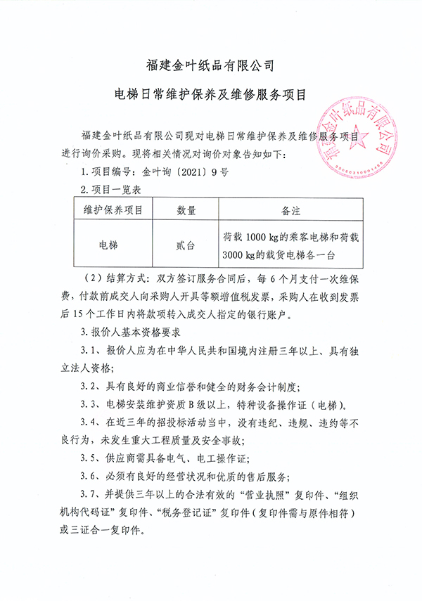 福建金葉紙品有限公司電梯日常維護保養及維修服務項目