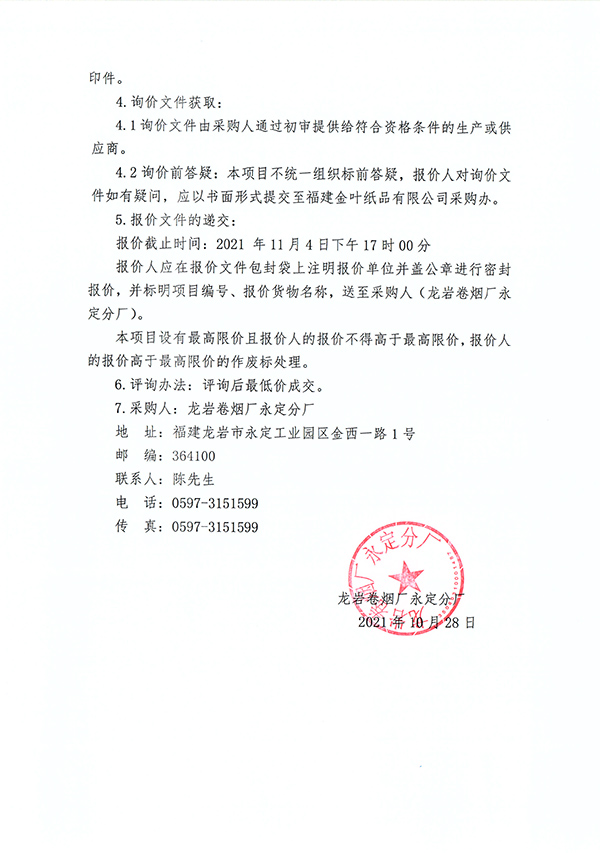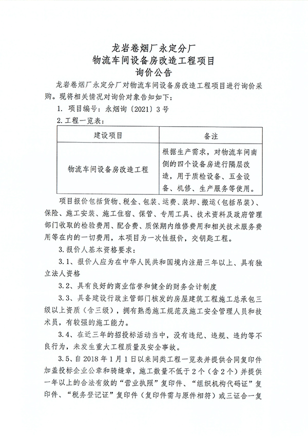 龍巖卷煙廠永定分廠物流車間設(shè)備房改造工程項目詢價公告