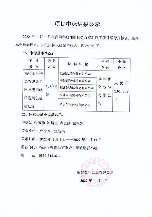 回收廢舊紙質卷煙包裝箱處置項目中標結果公示